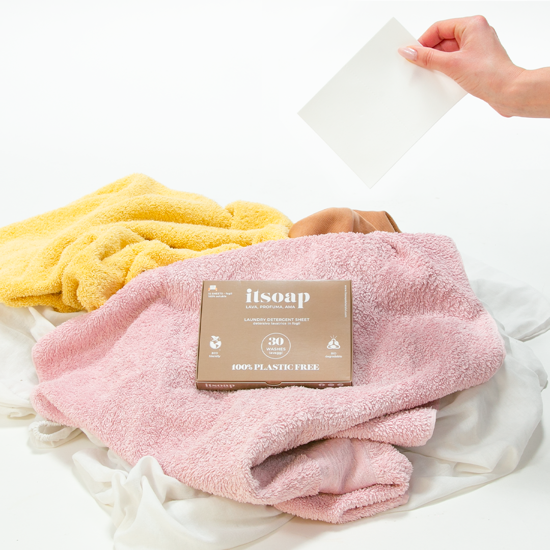 ITSOAP è un detersivo in fogli disidratato, ultra concentrato e privo di plastica. Basta inserire un foglio direttamente nel cestello della lavatrice o scioglierlo nell'acqua per i lavaggi a mano.